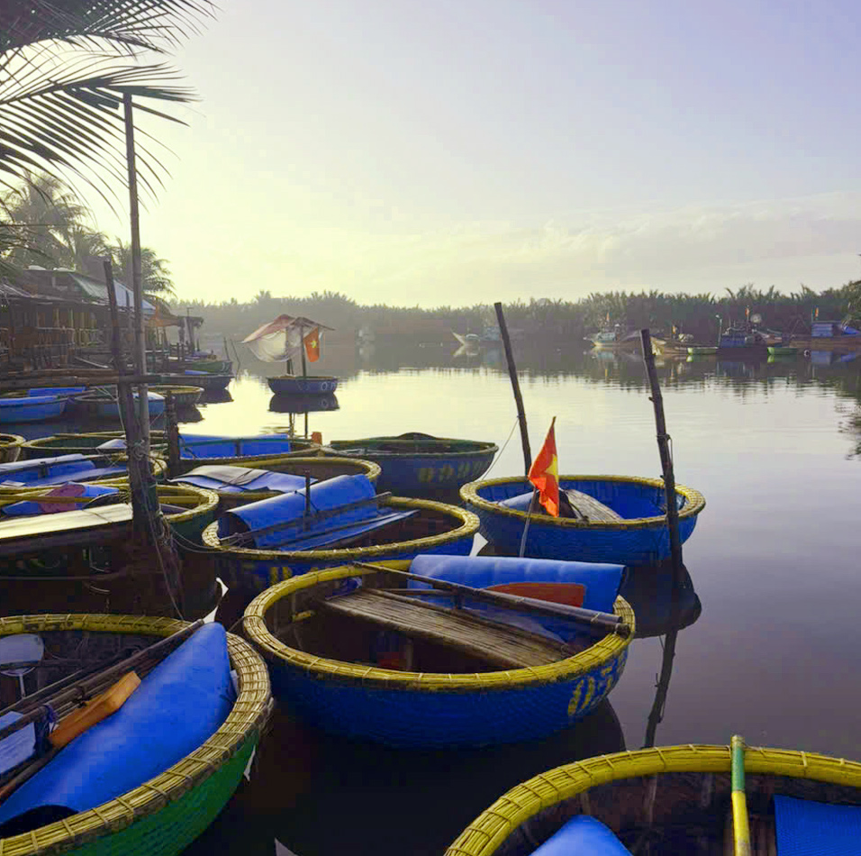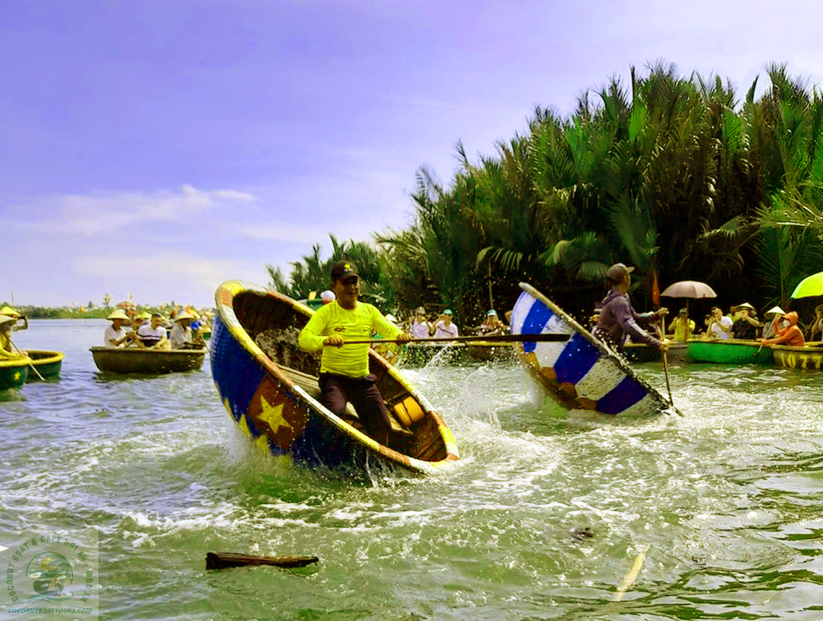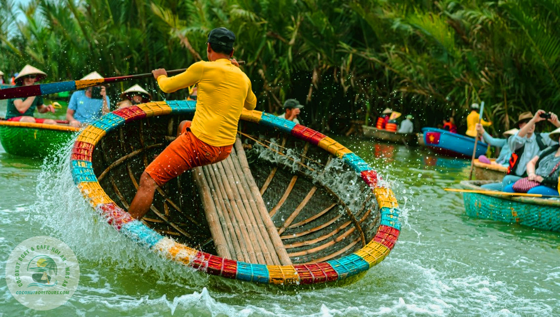 - Ride a traditional basket boat through the lush Cam Thanh coconut palms