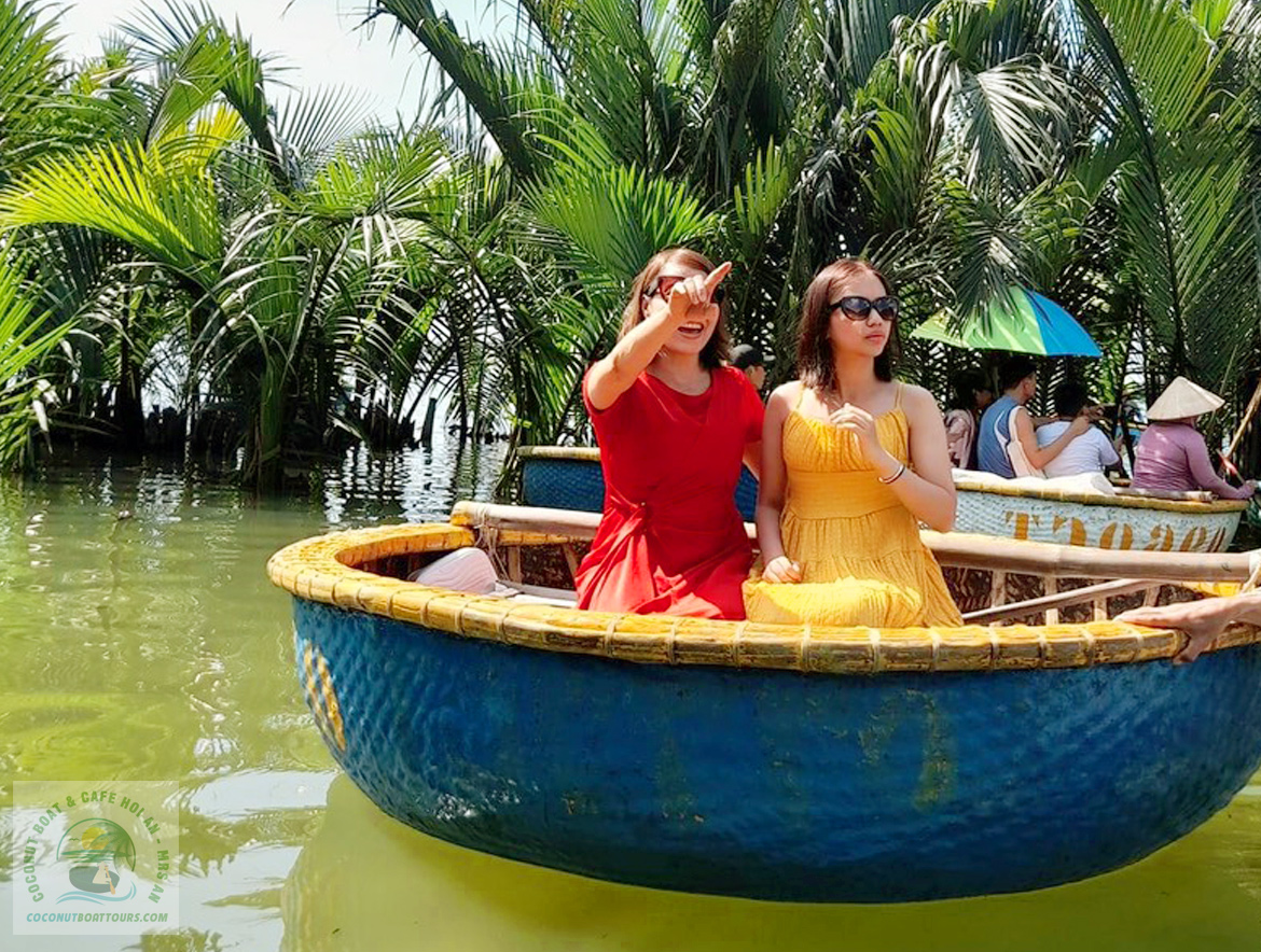 Guests ride on traditional basket boats — a signature vessel of central Vietnam fishermen — weaving through lush coconut palms and enjoying a peaceful, fresh atmosphere.